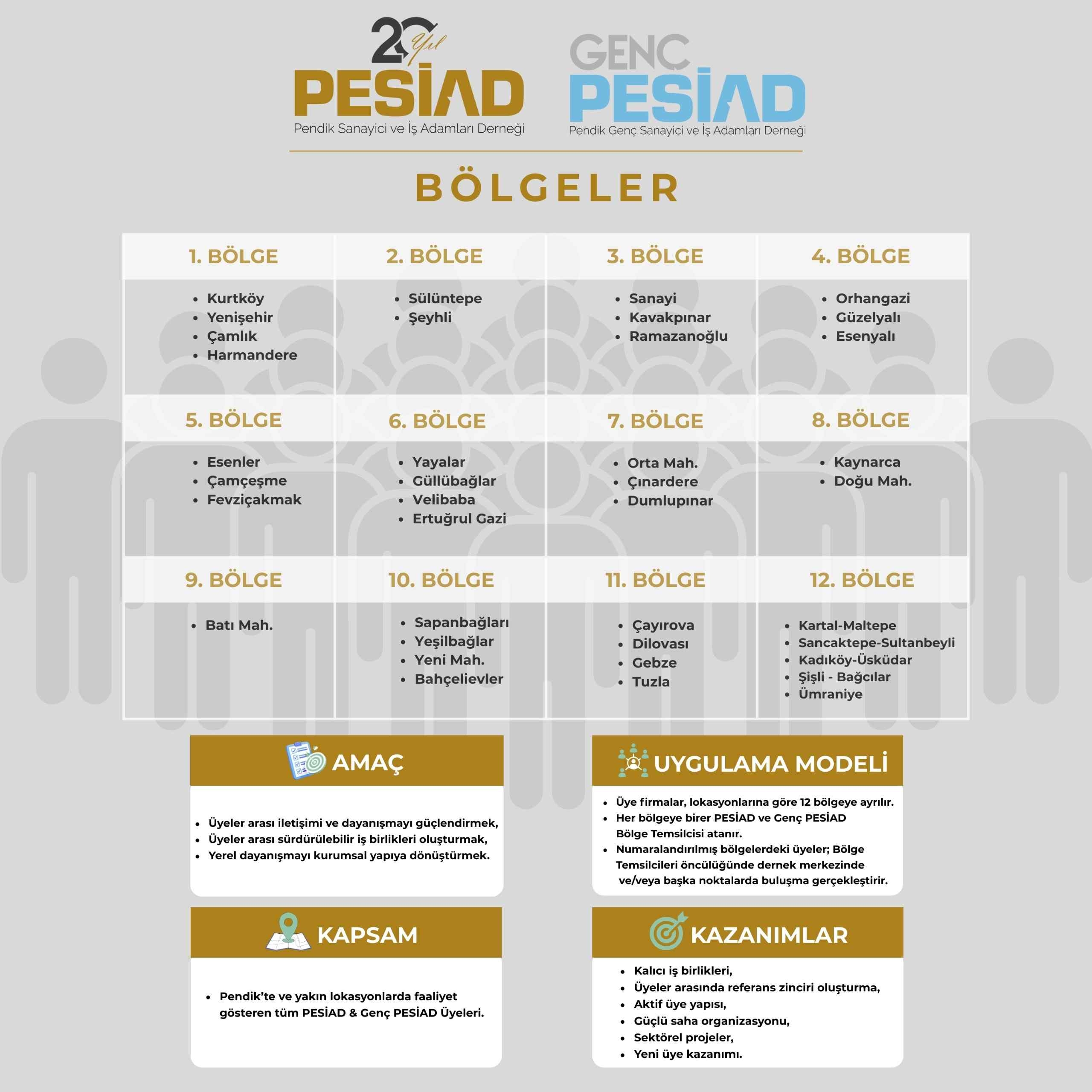 PESİAD üyeleri arasındaki iletişimi ve dayanışmayı güçlendirmek, karşılıklı tanışıklığı artırmak ve sürdürülebilir iş birlikleri oluşturmak amacıyla; Teşkilatlanma Birimimiz bünyesinde Bölge Buluşmaları Projesi hayata geçirilmektedir.